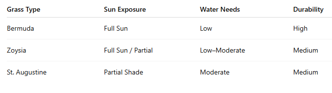 Bermuda and Zoysia are among the top choices due to their heat resistance and low water requirements.